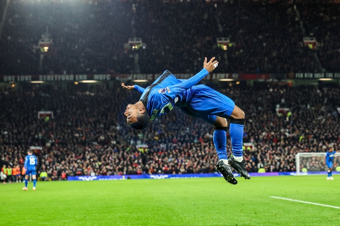 Eli Junior Kroupi of Bournemouth celebrates his goal to make it 4-4 during the Premier League match Manchester United vs Bournemouth at Old Trafford, Manchester, United Kingdom, 15th December 2025, Credit:Mark Cosgrove/News Images / Avalon