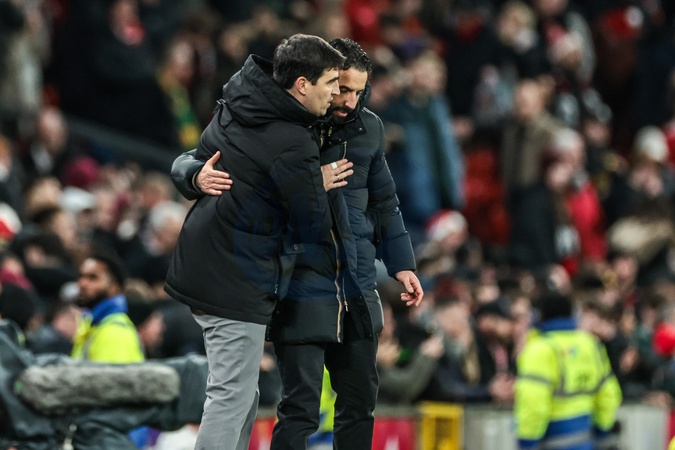 Andoni Iraola manager of Bournemouth shakes hands with Ruben Amorim manager of Manchester United after the game ends 4-4 during the Premier League match Manchester United vs Bournemouth at Old Trafford, Manchester, United Kingdom, 15th December 2025, Credit:Mark Cosgrove/News Images / Avalon