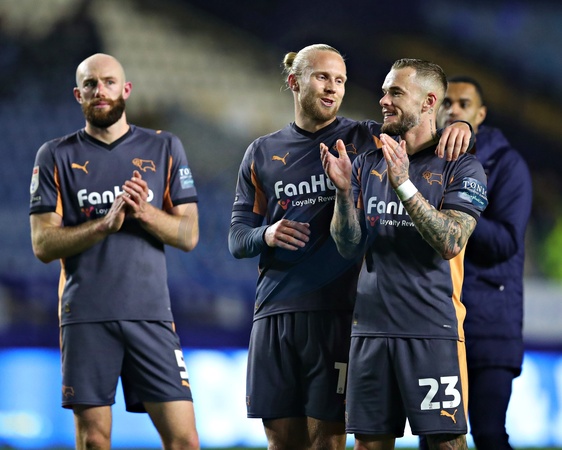 Lars-Jorgen Salvesen of Derby County and Craig Forsyth of Derby County celebrate after the Sky Bet Championship match Sheffield Wednesday vs Derby County at Hillsborough, Sheffield, United Kingdom, 15th December 2025, Credit:Sam Eaden/News Images / Avalon