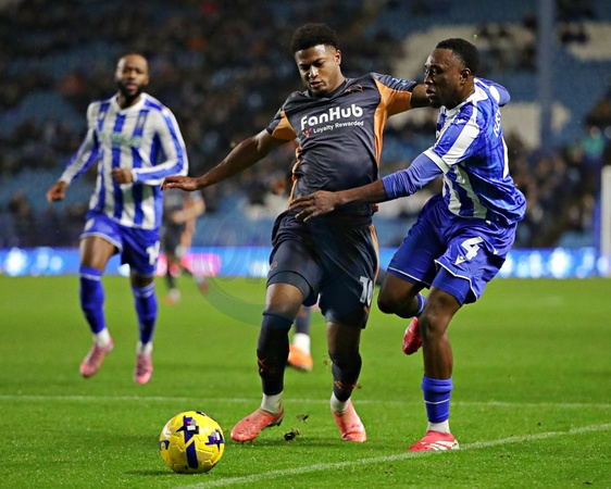 Sean Fusire of Sheffield Wednesday pressures Rhian Brewster of Derby County during the Sky Bet Championship match Sheffield Wednesday vs Derby County at Hillsborough, Sheffield, United Kingdom, 15th December 2025, Credit:Sam Eaden/News Images / Avalon