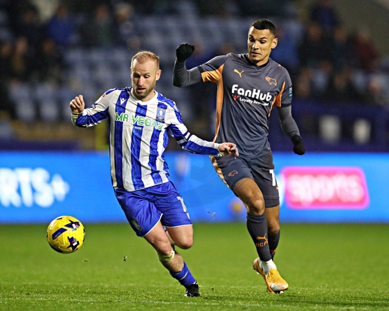 Kayden Jackson of Derby County pressures Barry Bannan of Sheffield Wednesday during the Sky Bet Championship match Sheffield Wednesday vs Derby County at Hillsborough, Sheffield, United Kingdom, 15th December 2025, Credit:Sam Eaden/News Images / Avalon