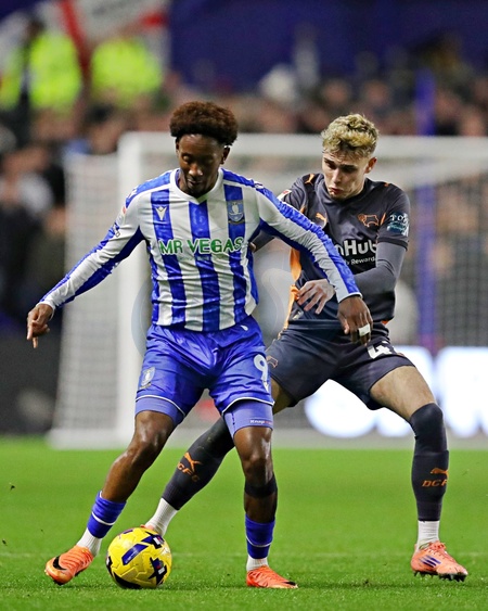 Bobby Clark of Derby County pressures Jamal Lowe of Sheffield Wednesday during the Sky Bet Championship match Sheffield Wednesday vs Derby County at Hillsborough, Sheffield, United Kingdom, 15th December 2025, Credit:Sam Eaden/News Images / Avalon
