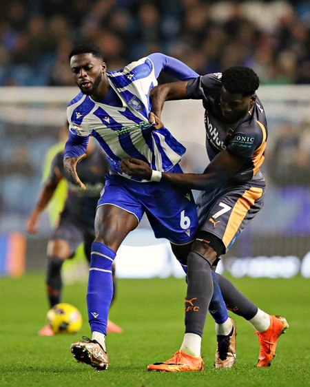 Patrick Agyemang of Derby County battles with Dominic Iorfa of Sheffield Wednesday during the Sky Bet Championship match Sheffield Wednesday vs Derby County at Hillsborough, Sheffield, United Kingdom, 15th December 2025, Credit:Sam Eaden/News Images / Avalon