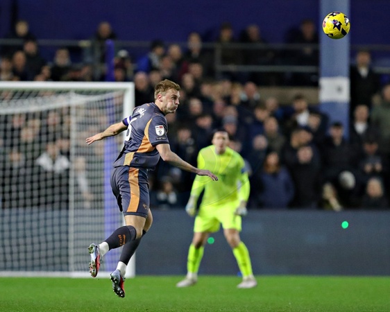 Sondre Langas of Derby County heads the ball during the Sky Bet Championship match Sheffield Wednesday vs Derby County at Hillsborough, Sheffield, United Kingdom, 15th December 2025, Credit:Sam Eaden/News Images / Avalon