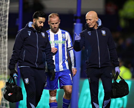 Barry Bannan of Sheffield Wednesday with Sheffield Wednesday physios during the Sky Bet Championship match Sheffield Wednesday vs Derby County at Hillsborough, Sheffield, United Kingdom, 15th December 2025, Credit:Sam Eaden/News Images / Avalon