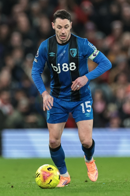 Adam Smith of Bournemouth with the ball during the Premier League match Manchester United vs Bournemouth at Old Trafford, Manchester, United Kingdom, 15th December 2025, Credit:Mark Cosgrove/News Images / Avalon