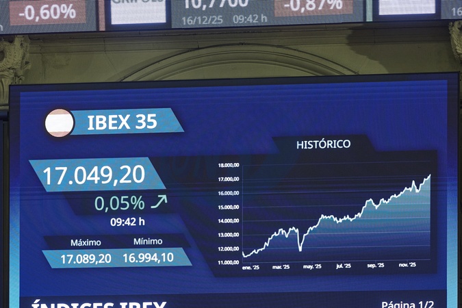 Information panels at the Palacio de la Bolsa de Madrid, on December 16, 2025, in Madrid (Spain). The Ibex 35 started today's session with a fall of 0.23%, which allows it to remain above the psychological level of 17,000 points, standing at 17,002.4 at around 9:00 a.m. Minutes after the start of the session, the main Spanish market indicator changed course and set a new all-time high at 17,062.7 points, after advancing 0.13%.DECEMBER 16;2025 12/16/2025, Credit:Jesús Hellín / Avalon