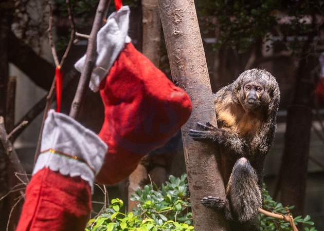 Saki monkeys with christmas stockings filled with festive treats, as the conservation zoo celebrates its Magic of Christmas event, at ZSL London Zoo in London, England. UK. Tuesday 16th December 2025, Credit:James Warren / Avalon