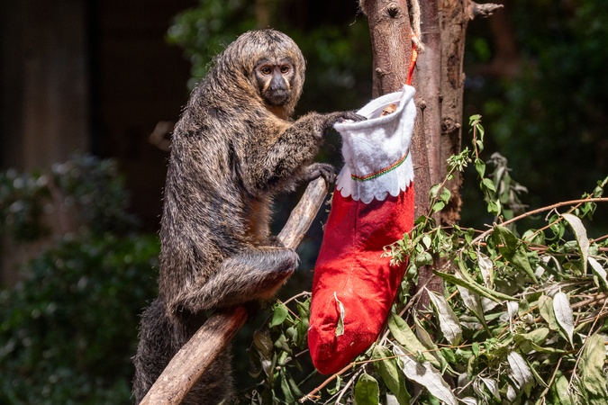 Saki monkeys with christmas stockings filled with festive treats, as the conservation zoo celebrates its Magic of Christmas event, at ZSL London Zoo in London, England. UK. Tuesday 16th December 2025, Credit:James Warren / Avalon