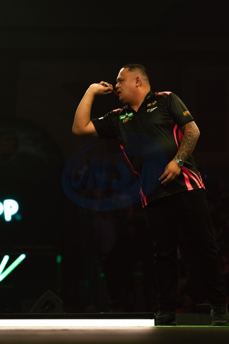Paolo Nebrida in action during day five of the 2025/26 Paddy Power World Darts Championship at Alexandra Palace LONDON, ENGLAND on 15th DECEMBER 2025., Credit:Oleksii Ovcharenko / Avalon