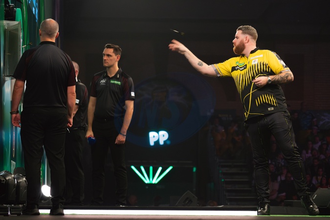 Scott Williams in action during day five of the 2025/26 Paddy Power World Darts Championship at Alexandra Palace LONDON, ENGLAND on 15th DECEMBER 2025., Credit:Oleksii Ovcharenko / Avalon