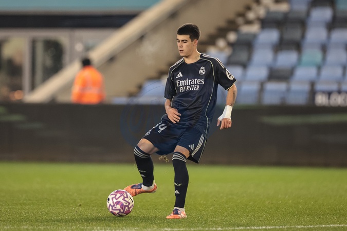 Alvaro Lezcano of Real Madrid with the ball during the Premier League International Cup match Manchester City vs Real Madrid at Joie Stadium, Manchester, United Kingdom, 16th December 2025, Credit:Mark Cosgrove/News Images / Avalon