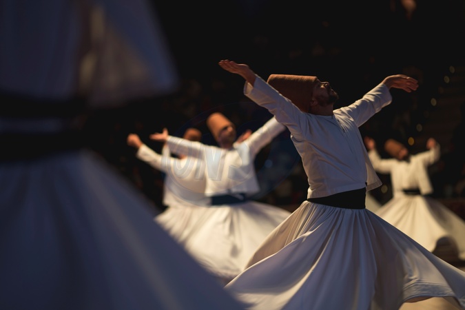 12/16/2025, Konya. Dancers wearing felt headdresses. During the week marking the 752nd anniversary of the death of the mystic Mevlana Celaleddin Rumi, musicians and semazen (whirling dervishes) performed at the Mevlana Kultur Merkezi in Konya., Credit:Valeria Ferraro / Avalon