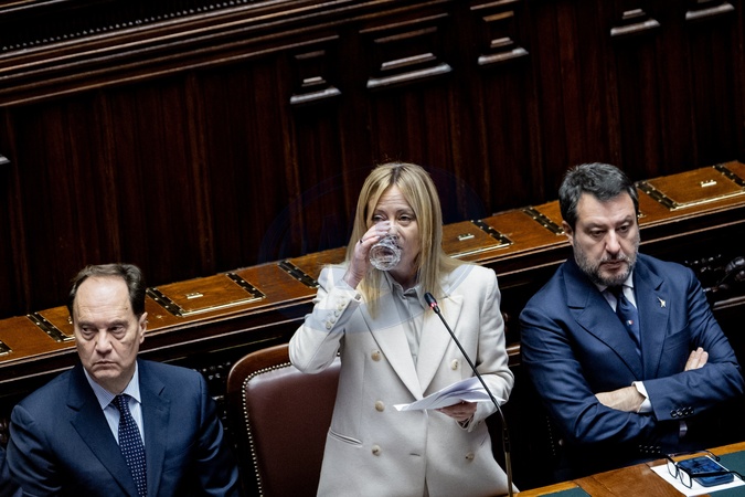 Chamber of Deputies, Communications from the Prime Minister in view of the European Council. Pictured are the Prime Minister Giorgia Meloni, the Minister for Relations with Parliament Luca Ciriani, and the Minister of Infrastructure and Transport Matteo Salvini. ROme, Dec 17th 2025, Credit:Francesco Fotia / Avalon