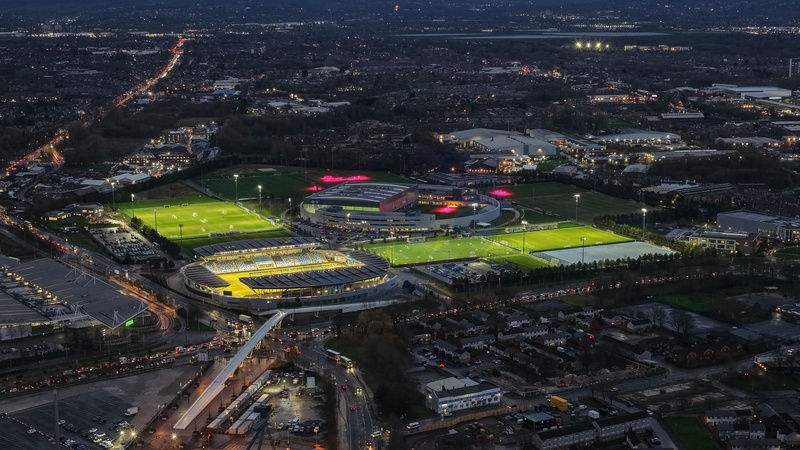 An aerial view of the Etihad Campus and the Joie Stadium under the lights during the Carabao Cup Quarter Final match Manchester City vs Brentford at Etihad Stadium, Manchester, United Kingdom, 17th December 2025, Credit:Mark Cosgrove/News Images / Avalon