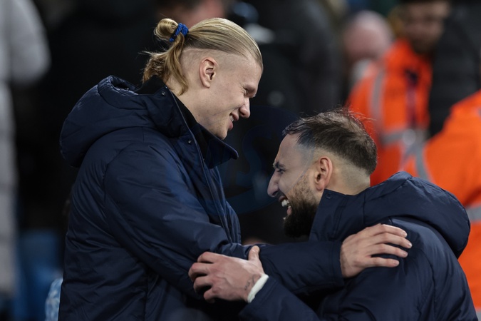 Erling Haaland of Manchester City and Manchester City goalkeeper Gianluigi Donnarumma laughing and both on the bench during the Carabao Cup Quarter Final match Manchester City vs Brentford at Etihad Stadium, Manchester, United Kingdom, 17th December 2025, Credit:Mark Cosgrove/News Images / Avalon