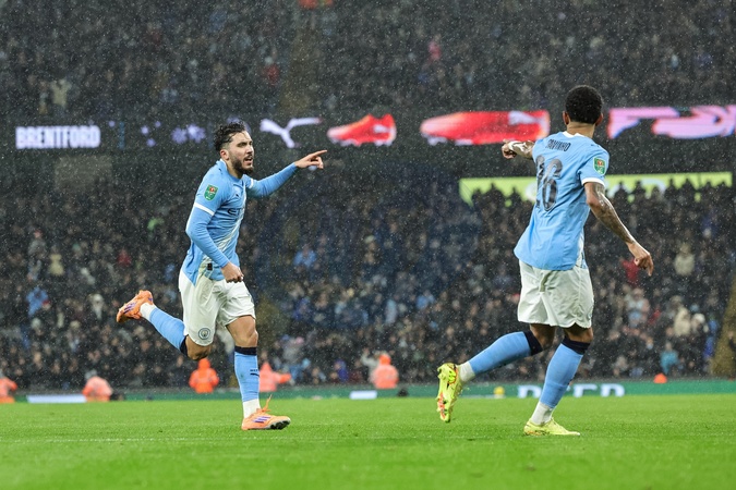 Rayan Cherki of Manchester City celebrates his goal to make it 1-0 during the Carabao Cup Quarter Final match Manchester City vs Brentford at Etihad Stadium, Manchester, United Kingdom, 17th December 2025, Credit:Mark Cosgrove/News Images / Avalon
