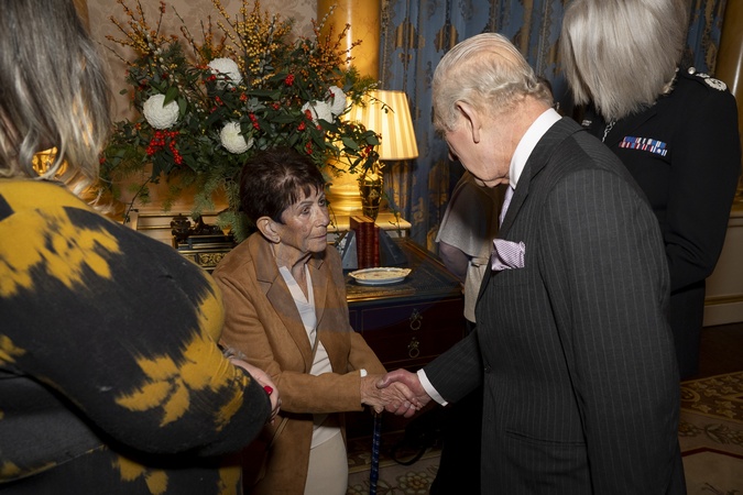 King Charles III (right) greets Christina Jones and friend Sarah Young during a reception at Buckingham Palace in London for members of the public and railway staff who showed particular bravery in response to the attack in Huntingdon in Cambridgeshire. Picture date: Wednesday December 17, 2025., Credit:Aaron Chown / Avalon