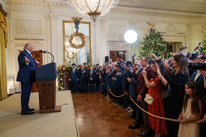 President Donald Trump participates in a Hanukkah Reception in the East Wing of the White House, Tuesday, December 16, 2025., Credit:Abe McNatt / Avalon