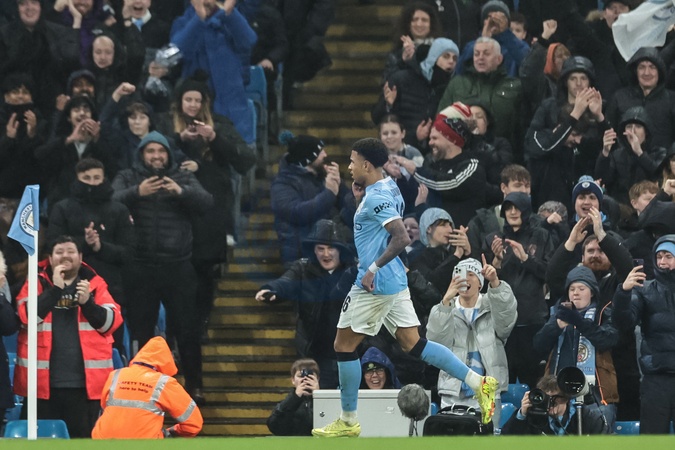Savinho of Manchester City celebrates his goal to make it 2-0 during the Carabao Cup Quarter Final match Manchester City vs Brentford at Etihad Stadium, Manchester, United Kingdom, 17th December 2025, Credit:Mark Cosgrove/News Images / Avalon