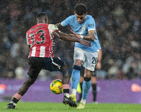 Savinho of Manchester City and Michael Kayode of Brentford battle for the ball during the Carabao Cup Quarter Final match Manchester City vs Brentford at Etihad Stadium, Manchester, United Kingdom, 17th December 2025, Credit:Mark Cosgrove/News Images / Avalon