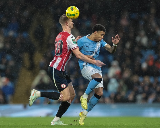 Kristoffer Ajer of Brentford and Savinho of Manchester City battle for the ball during the Carabao Cup Quarter Final match Manchester City vs Brentford at Etihad Stadium, Manchester, United Kingdom, 17th December 2025, Credit:Mark Cosgrove/News Images / Avalon