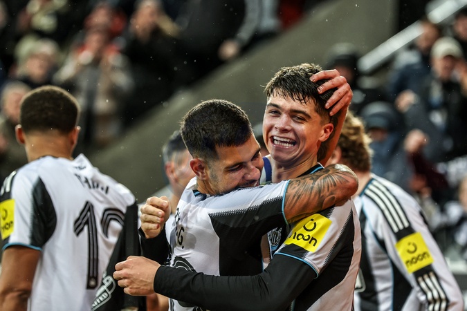 Lewis Miley of Newcastle United celebrates his goal to make it 2-1 during the Carabao Cup Quarter Final match Newcastle United vs Fulham at St. James's Park, Newcastle, United Kingdom, 17th December 2025, Credit:Ae Cosgrove/News Images / Avalon