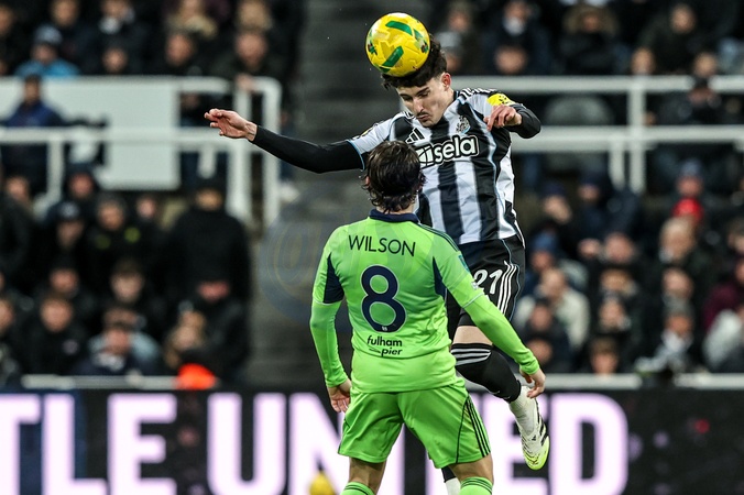 Tino Livramento of Newcastle United jumps up to win the high ball under pressure from Harry Wilson of Fulham during the Carabao Cup Quarter Final match Newcastle United vs Fulham at St. James's Park, Newcastle, United Kingdom, 17th December 2025, Credit:Ae Cosgrove/News Images / Avalon