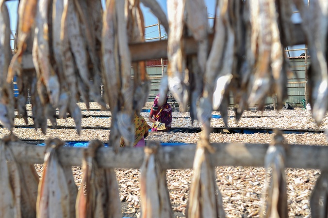 Chattogram, Bangladesh- Workers process fish at an open drying yard in Chattogram, Bangladesh. The fish are cleaned, salted, and sun-dried on bamboo platforms for four to seven days, depending on weather conditions. Dry fish processing requires consistent heat and remains a vital food source in Bangladesh, accounting for the fourth-largest share of fish consumption and providing an affordable protein across all income levels. The dried fish are distributed for domestic use and export., Credit:Md Rafayat Haque Khan / Avalon