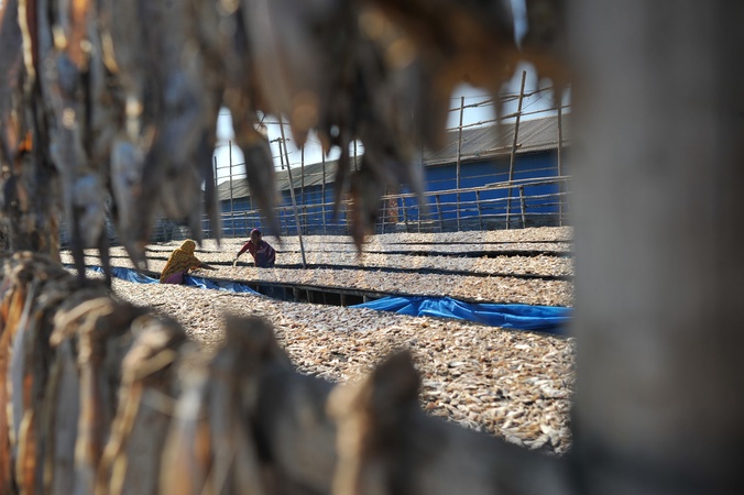 Chattogram, Bangladesh- Workers process fish at an open drying yard in Chattogram, Bangladesh. The fish are cleaned, salted, and sun-dried on bamboo platforms for four to seven days, depending on weather conditions. Dry fish processing requires consistent heat and remains a vital food source in Bangladesh, accounting for the fourth-largest share of fish consumption and providing an affordable protein across all income levels. The dried fish are distributed for domestic use and export., Credit:Md Rafayat Haque Khan / Avalon