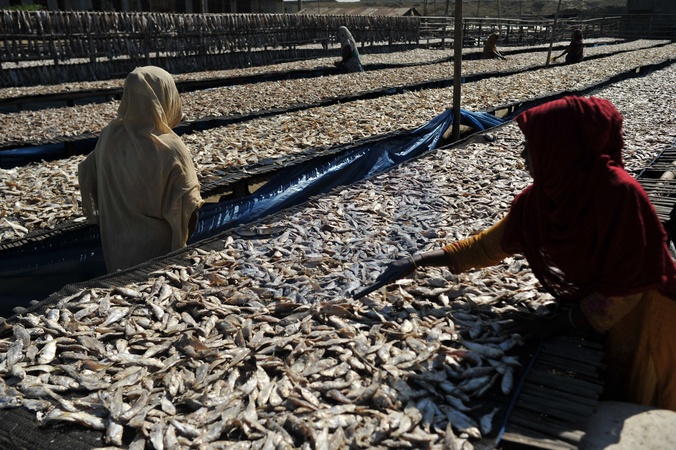 Chattogram, Bangladesh- Workers process fish at an open drying yard in Chattogram, Bangladesh. The fish are cleaned, salted, and sun-dried on bamboo platforms for four to seven days, depending on weather conditions. Dry fish processing requires consistent heat and remains a vital food source in Bangladesh, accounting for the fourth-largest share of fish consumption and providing an affordable protein across all income levels. The dried fish are distributed for domestic use and export., Credit:Md Rafayat Haque Khan / Avalon
