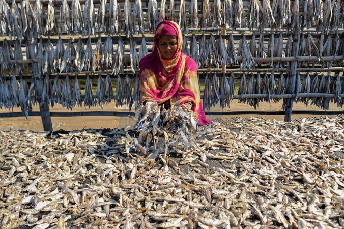 Chattogram, Bangladesh- Workers process fish at an open drying yard in Chattogram, Bangladesh. The fish are cleaned, salted, and sun-dried on bamboo platforms for four to seven days, depending on weather conditions. Dry fish processing requires consistent heat and remains a vital food source in Bangladesh, accounting for the fourth-largest share of fish consumption and providing an affordable protein across all income levels. The dried fish are distributed for domestic use and export., Credit:Md Rafayat Haque Khan / Avalon