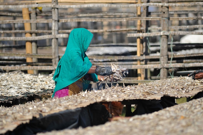 Chattogram, Bangladesh- Workers process fish at an open drying yard in Chattogram, Bangladesh. The fish are cleaned, salted, and sun-dried on bamboo platforms for four to seven days, depending on weather conditions. Dry fish processing requires consistent heat and remains a vital food source in Bangladesh, accounting for the fourth-largest share of fish consumption and providing an affordable protein across all income levels. The dried fish are distributed for domestic use and export., Credit:Md Rafayat Haque Khan / Avalon