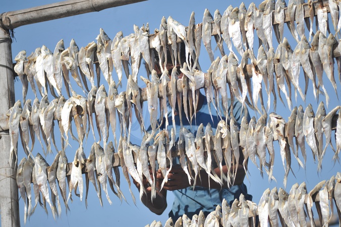 Chattogram, Bangladesh- Workers process fish at an open drying yard in Chattogram, Bangladesh. The fish are cleaned, salted, and sun-dried on bamboo platforms for four to seven days, depending on weather conditions. Dry fish processing requires consistent heat and remains a vital food source in Bangladesh, accounting for the fourth-largest share of fish consumption and providing an affordable protein across all income levels. The dried fish are distributed for domestic use and export., Credit:Md Rafayat Haque Khan / Avalon
