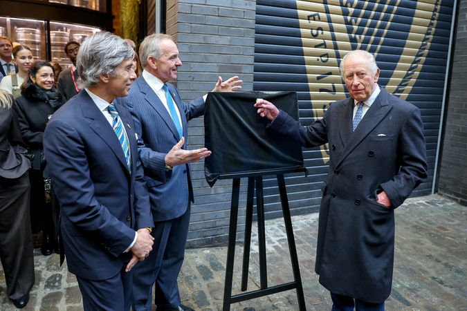 King Charles III (R) unveils a plaque to mark the official opening of the Brewery, next to Nik Jhangiani, Interim Chief Executive Officer of Diageo plc and John Manzoni, Chair of Diageo plc during his visit to Guinness Open Gate Brewery London on December 18, 2025 in London, England., Credit:Avalon.red / Avalon