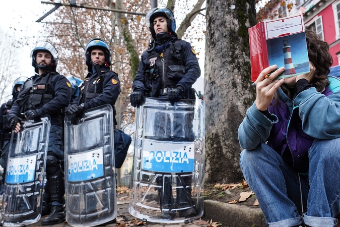 December 18, 2025, Turin, Corso Regina 47. The Askatasuna social center was searched and cleared. Pictured is a protester reading a few steps from the police cordon., Credit:Selene Daniele / Avalon