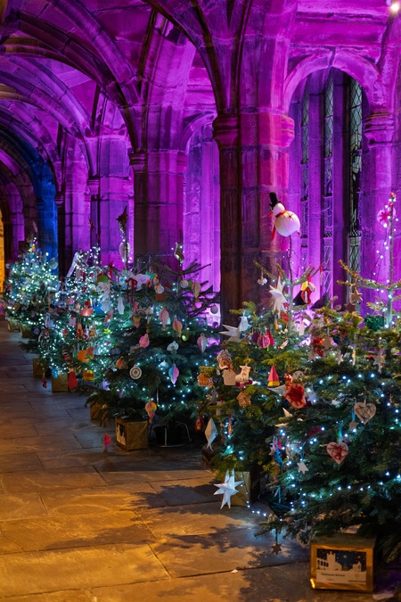 Christmas trees on display within Chester cathedral at Christmas time. Chester, Cheshire, North west England.