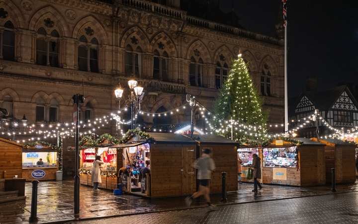 Christmas market in Chester at Christmas time. Chester, Cheshire, North west England.