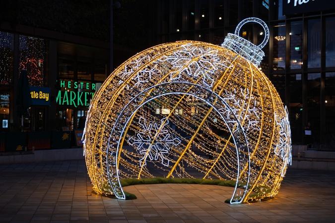 Illuminated large bauble by the market at Chester at Christmas time. Chester, Cheshire, North west England.