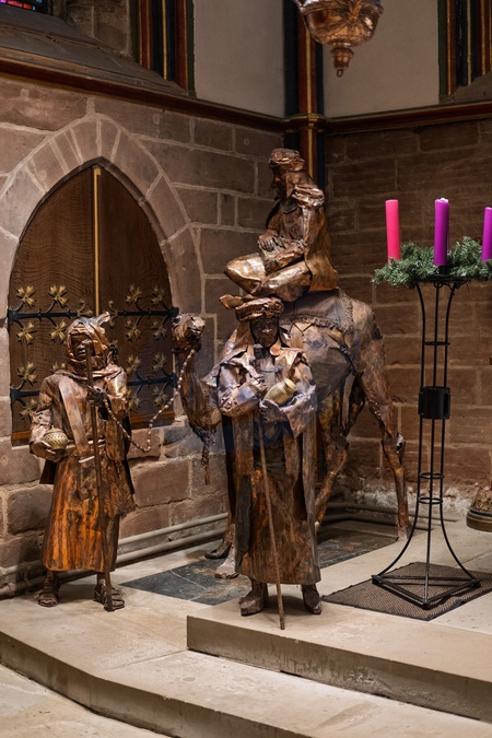 Statue of three Kings as part of Nativity scenes within Chester cathedral at Christmas time. Chester, Cheshire, North west England.