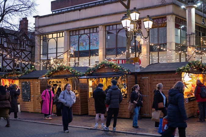 Market in Chester at Christmas time. Chester, Cheshire, North west England.