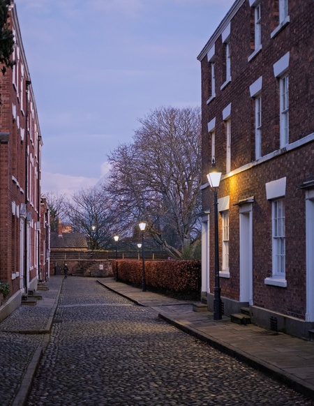 Cobbled street near the Cathedral . Chester, Cheshire, North west England.