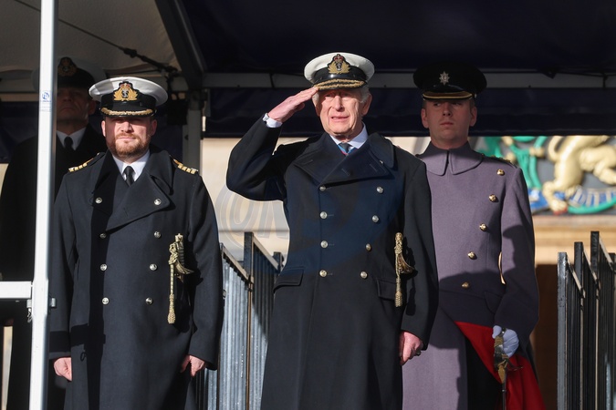 King Charles III, The Lord High Admiral (C) and Captain Andrew Bray (L) preside over the Lord High Admiral's Parade at Britannia Royal Naval College on December 19, 2025 in Dartmouth, England. King Charles III, The Lord High Admiral, presides over the Lord High Admiral's Divisions at Britannia Royal Naval College (BRNC), where he oversees the blessing of the King's new colours and inspects the front ranks, Credit:Avalon.red / Avalon