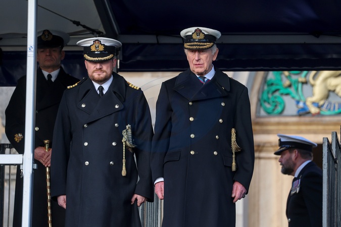 King Charles III, The Lord High Admiral (R) and Captain Andrew Bray (L) preside over the Lord High Admiral's Parade at Britannia Royal Naval College on December 19, 2025 in Dartmouth, England. King Charles III, The Lord High Admiral, presides over the Lord High Admiral's Divisions at Britannia Royal Naval College (BRNC), where he oversees the blessing of the King's new colours and inspects the front ranks, Credit:Avalon.red / Avalon