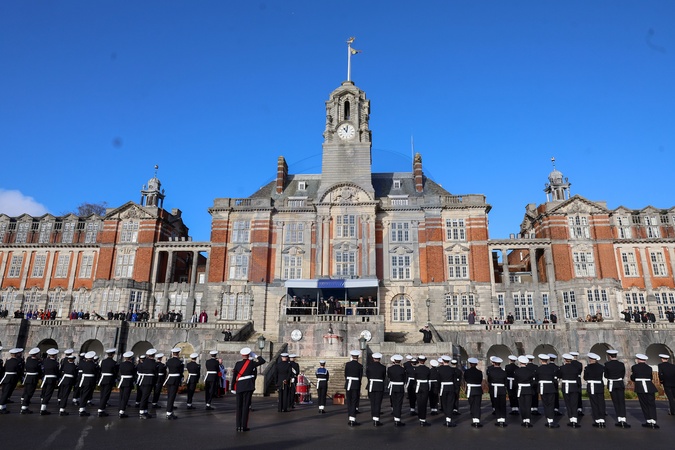 King Charles III, The Lord High Admiral (C) and Captain Andrew Bray (L) preside over the Lord High Admiral's Parade in front of Royal Navy Cadets standing at attention at Britannia Royal Naval College on December 19, 2025 in Dartmouth, England. King Charles III, The Lord High Admiral, presides over the Lord High Admiral's Divisions at Britannia Royal Naval College (BRNC), where he oversees the blessing of the King's new colours and inspects the front ranks, Credit:Avalon.red / Avalon
