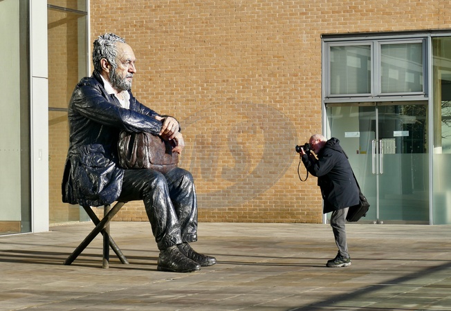 Sculptures at The ‘Who Am I?' Exhition at The Said School. This major exhibition brings together sculptures by celebrated British artist Sean Henry within the striking Saïd Business School in Oxford. Created between 2001 and 2024, these figurative works are installed throughout the School's lobby and Romanesque corridors, culminating in the monumental Seated Figure a three-metre-high bronze that looks out onto the city from the School's public courtyard.The exhibition invites visitors to reflect on themes of identity, perception, and connection. Henry's polychrome sculptures, painted in naturalistic tones, feel at once familiar and enigmatic. Through their scale, posture, and expression, they prompt questions about who we are, how we see others, and how art can reframe our sense of self within public space., Credit:Geoffrey Swaine / Avalon