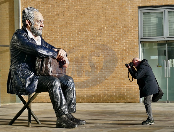Sculptures at The ‘Who Am I?' Exhition at The Said School. This major exhibition brings together sculptures by celebrated British artist Sean Henry within the striking Saïd Business School in Oxford. Created between 2001 and 2024, these figurative works are installed throughout the School's lobby and Romanesque corridors, culminating in the monumental Seated Figure a three-metre-high bronze that looks out onto the city from the School's public courtyard.The exhibition invites visitors to reflect on themes of identity, perception, and connection. Henry's polychrome sculptures, painted in naturalistic tones, feel at once familiar and enigmatic. Through their scale, posture, and expression, they prompt questions about who we are, how we see others, and how art can reframe our sense of self within public space., Credit:Geoffrey Swaine / Avalon