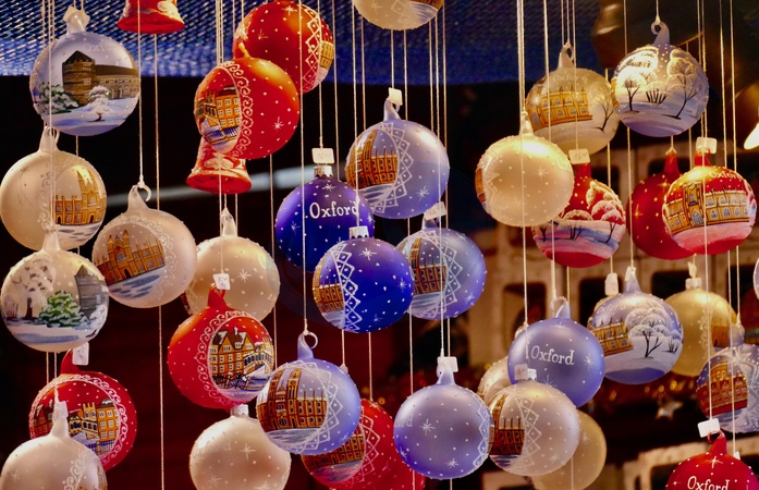 Oxford baubles for sale in the Christmas Market in Broad Street., Credit:Geoffrey Swaine / Avalon