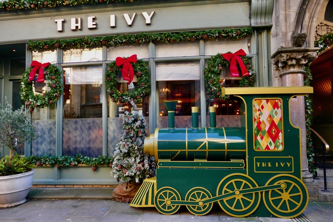 The Ivy on Oxford is decorated for Christmas with a steam train outside., Credit:Geoffrey Swaine / Avalon