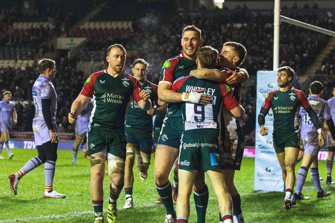 Freddie Steward of Leicester Tigers celebrates with Tom Whiteley of Leicester Tigers after scoring a try during the Gallagher Premiership match Leicester Tigers vs Gloucester Rugby at Mattioli Woods Welford Road Stadium, Leicester, United Kingdom, 19th December 2025, Credit:Craig Evans/News Images / Avalon
